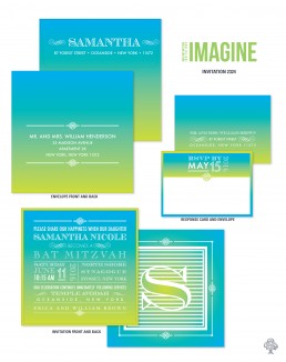 This eye catching Bat Mitzvah invitation is digitally printed and film laminated on Avon White paper with different shades of Blue and Green and a unique type layout. It is layered on Terra Green paper laminated to a White board and a back is digitally printed with an artful complementing pattern with a prominent initial. The color combinations are easy to change. The impression begins with digitally printed custom envelope in colors matching the invitation.