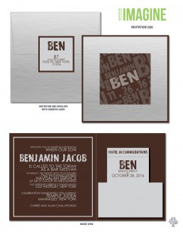 This magnificent Bar Mitzvah invitation is not only lush but functional. Its Brown Plike cover die cut folder with a brushed aluminum frame and clear plastic window with a name silk screened in Silver gives your guests a peek to see a repeat type sequence done Tone on Tone on Brown Plike and when you open fully open the invitation it reveals the wording elegantly silk-screened in Silver with a pocket to hold the other enclosures. Wonderful for a destination Bar Mitzvah or just to keep the whole ensemble organized in the classiest way. Includes a custom die cut Brushed Aluminum envelope and 2 layer address label.