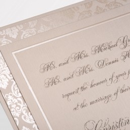Any couple considering a classically designed invitation suite should enjoy this selection. The top layer is an Eggshell paper with Pearl border, the middle is an Ananas Print, and the bottom is Heavy Eggshell. The Light Grey Thermography ink with Silver Sparkles goes perfectly with the paper selection and the Ananas Print on the invitation and envelope lining. This wonderful invitation suite is ideal for any couple interested in an elegant wedding stationery choice.